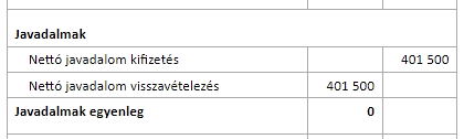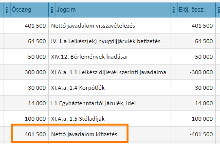 A mintában a bekeretezett nettó kifizetésből a fölötte megjelenő tételeket generálja a javadalom könyvelés funkció.
